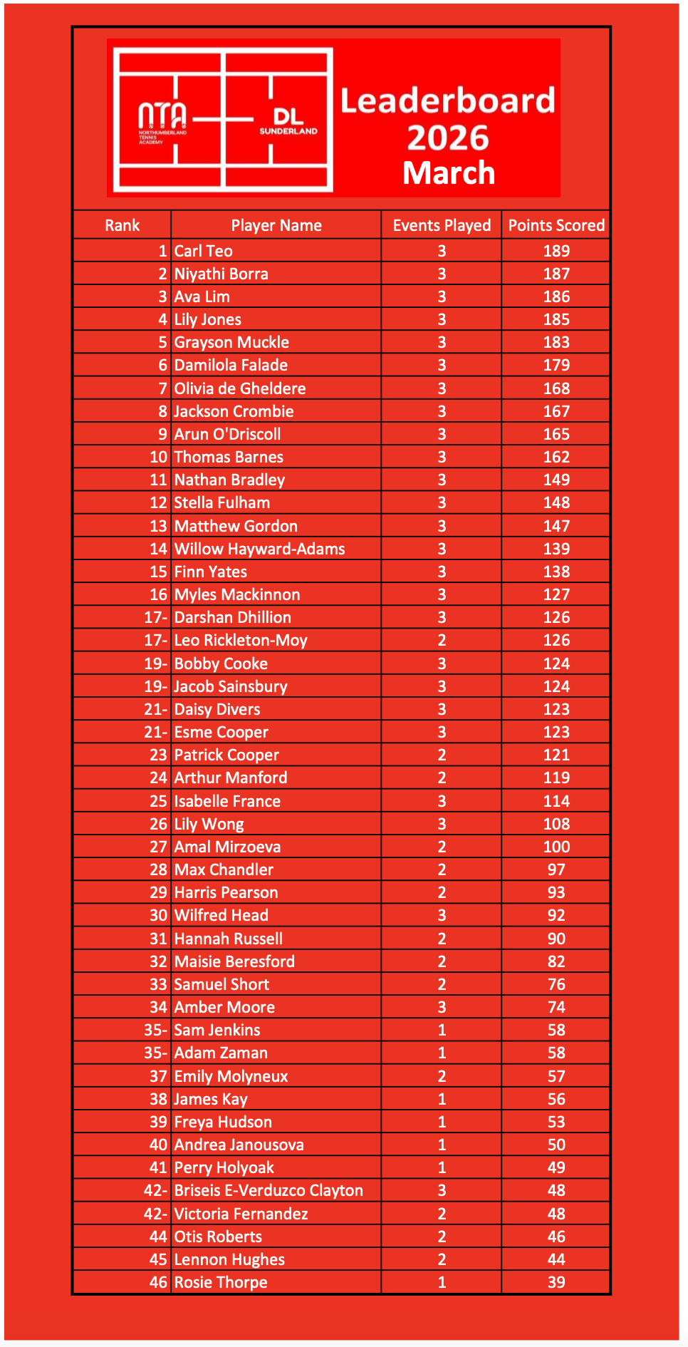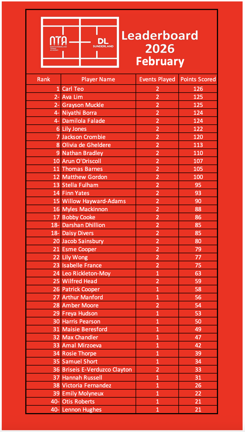 Leading on from another successful 2025 leaderboard, with over 50 players participating we are back again for 2026. The Circuit leaderboard runs between Northumberland Tennis Academy and David Lloyd Sunderland, open to all players born 2018 or after. This is aimed at players who are ready to be introduced into competition in a fun relaxed environment, where every point they earn in their match will contribute to their leaderboard total, so every point counts!